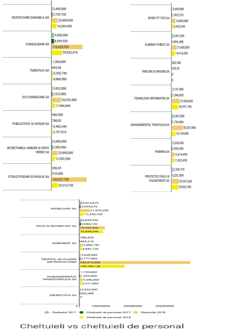 De asemenea, pentru 2018, avem o supraestimare a veniturilor companiilor, în unele cazuri, cei ce s-au ocupat de estimarea bugetului de venituri pentru S.A.-uri prevăd încasări de peste 100 milioane lei. Este cazul Străzi şi Poduri S.A. cu 144.500.000 lei sau Trustul de Clădiri Metropolitane S.A. cu nu mai puţin de 363.150.000 lei. Pentru Parcuri şi Grădini S.A. şi Energetica S.A. nu avem venituri estimate pentru 2018.