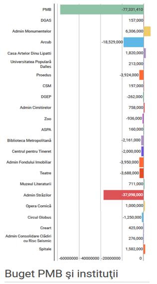Mai departe vom vedea impactul rectificării asupra instituţilor din subordinea Primăriei şi cum au fost prioritizaţi banii. Aşa cum putem observa, avem tăieri importante de sume cam peste tot şi ce este mai grav, că mare parte din aceste sume au fost tăiate din investiţii. Desigur, cea mai importantă tăiere este la PMB, 77 milioane lei, iar mai sus putem vedea ce a însemnat această tăiere.O altă tăiere importantă a bugetului este la ARCUB, cu 18.529.000 lei în minus în timp ce cea mai importantă sumă de bani adăugată la un buget este desigur, la Administraţia Monumentelor, cu 6.306.000 lei. Le vom lua însă pe rând, pentru a le detalia.